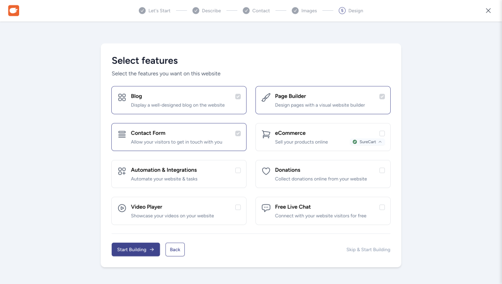 - Configure your website as you need until you reach the Select Features panel. Here, select the features you want and click Start Building.