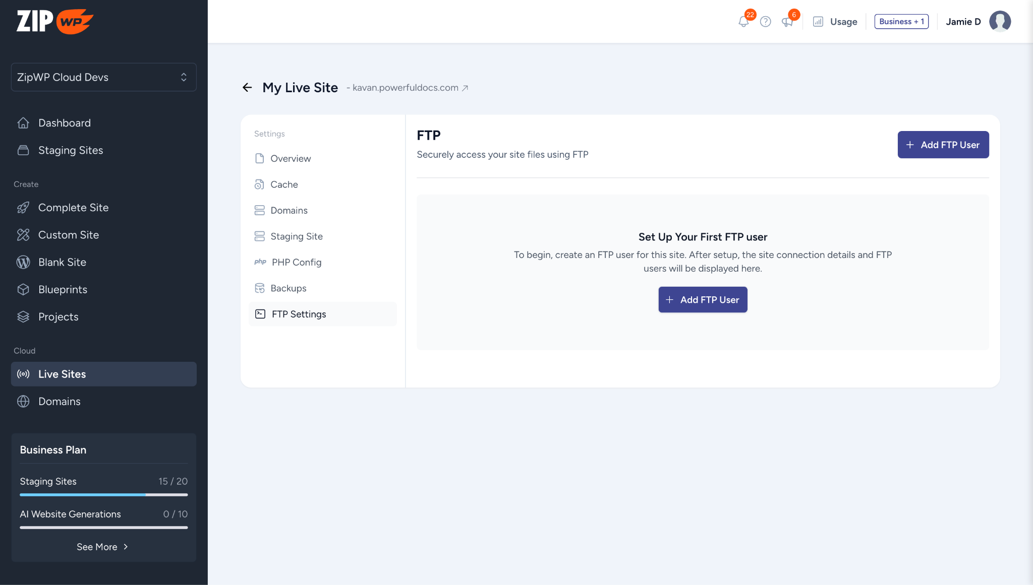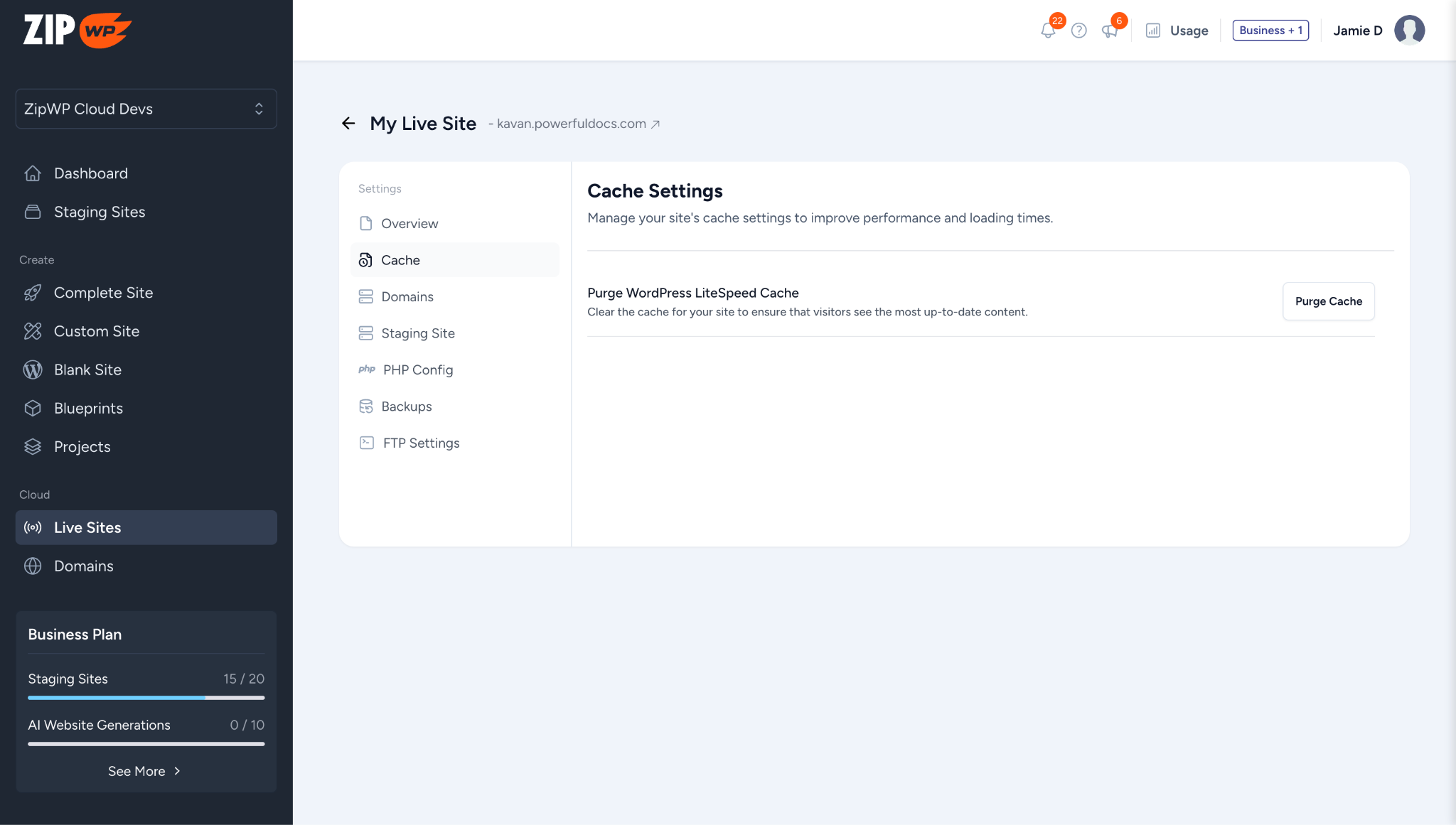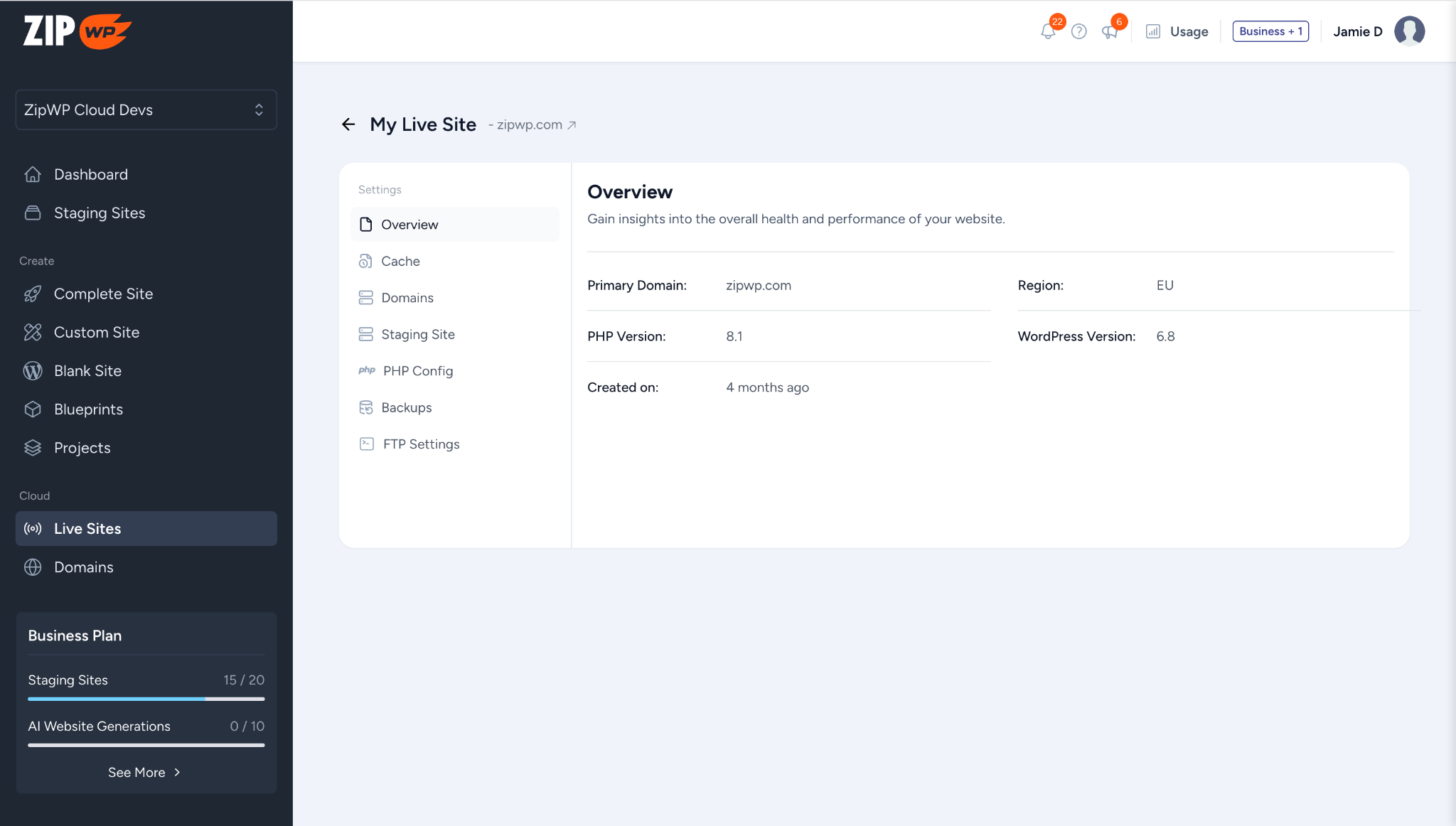 The ZipWP Cloud Dashboard gives you a clear, centralized view of your live WordPress sites and hosting settings. From creating new sites to managing domains, backups, and PHP configurations, everything is just a few clicks away.