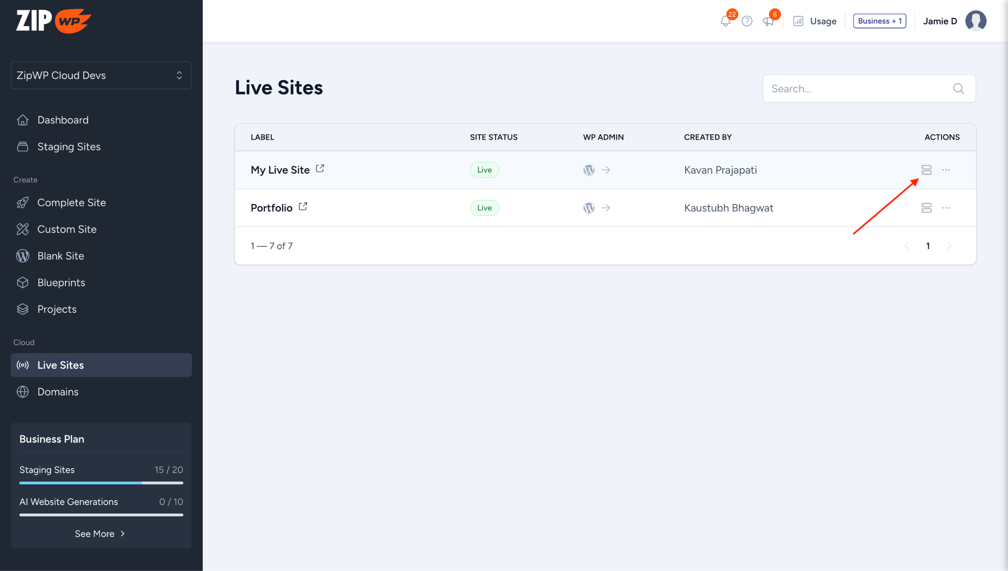 When you open Live Sites from the left sidebar, you’ll see a list of all your live websites.