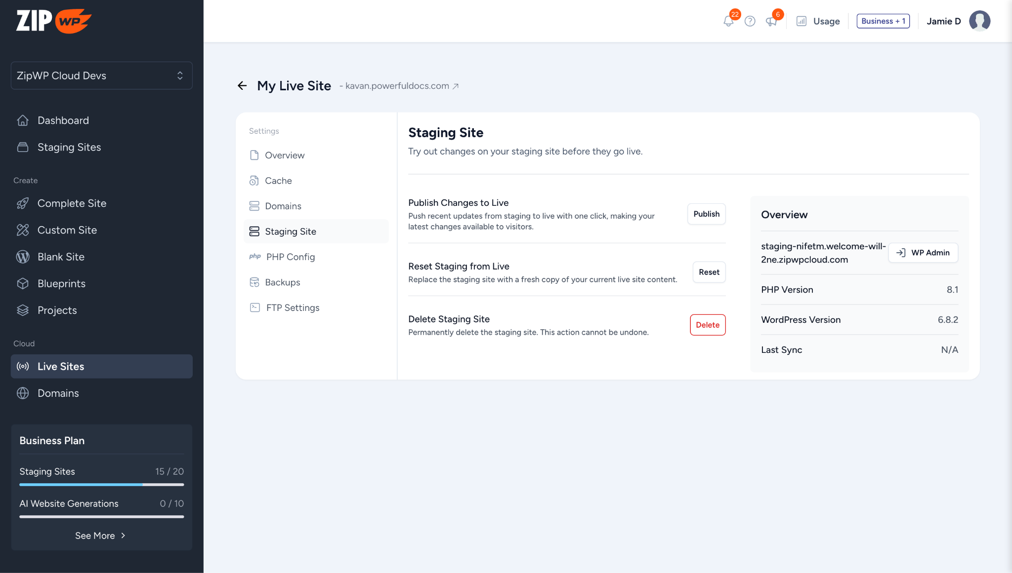 Once you move a staging site to the cloud, you can access and control every aspect of it from this dashboard.
