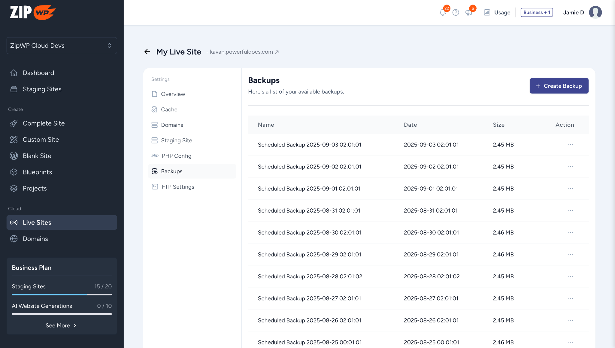 Create, manage, and restore backups for disaster recovery. ZipWP automatically creates backups of your site every day.