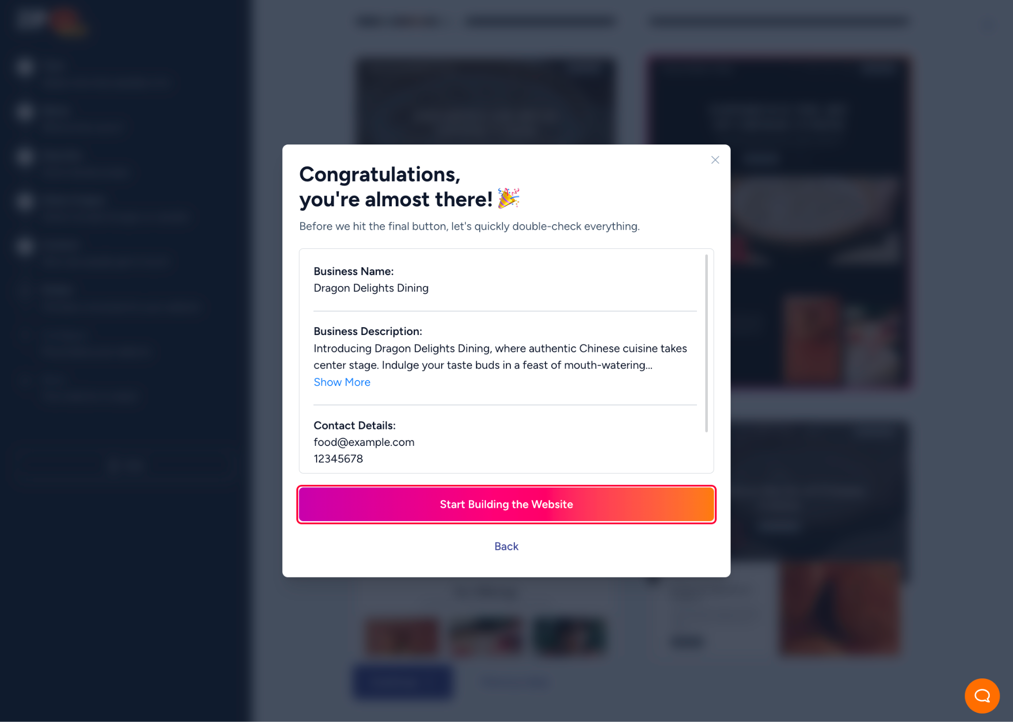 - That brings you to the last step. You can review the details you provided, and if you feel satisfied with them, click on the Start Building Website button.