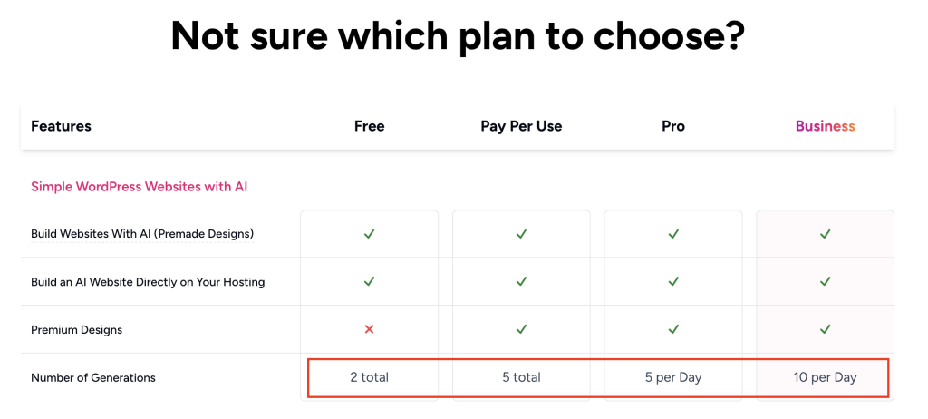 For example, if you’re on the Pro plan, you can create an unlimited number of blank websites and 5 AI website drafts per day.