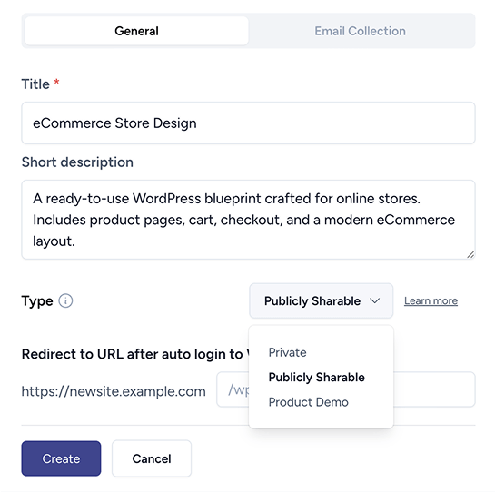 Add a name and description, then choose if you want to reuse it, share it, or showcase it as a demo.