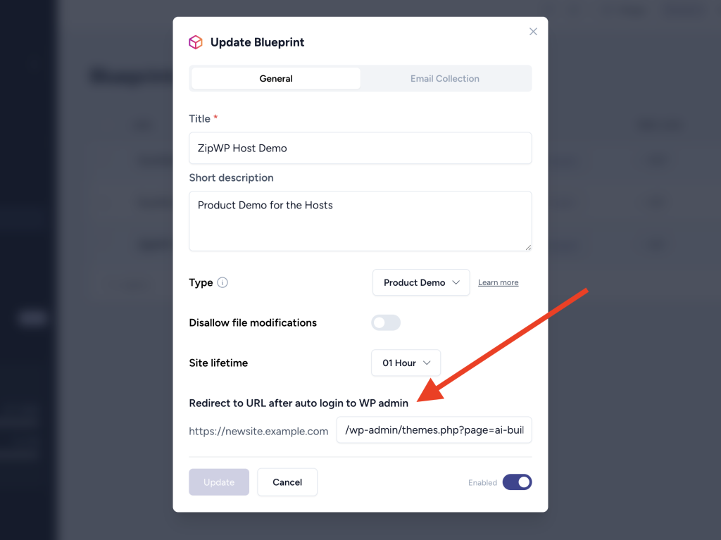 We’ve added an option to redirect users to any URL after they build a site using your Blueprint link.
