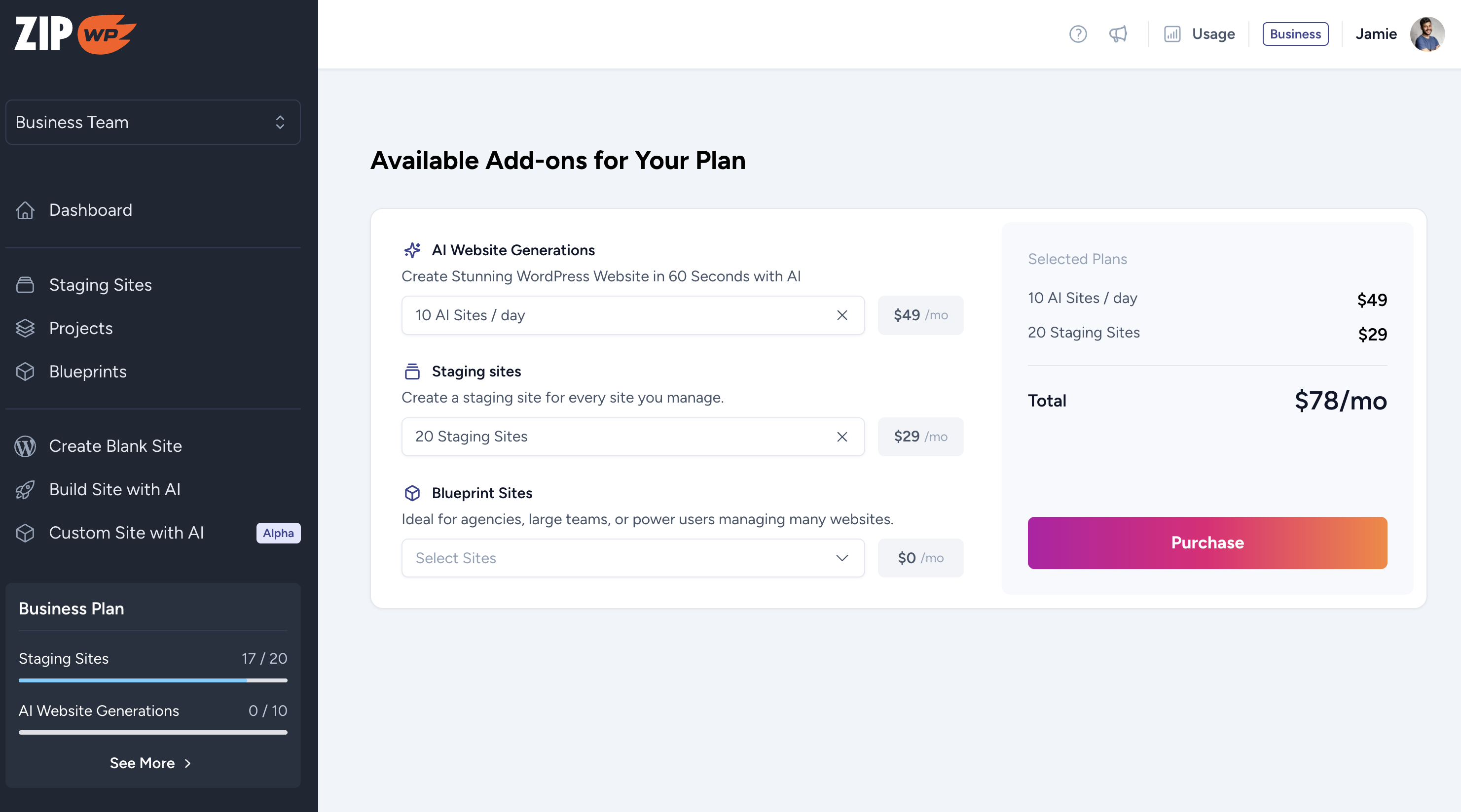 The ZipWP Blueprints feature is available on the ZipWP Pro and Business plans. If you’re not already on one of these plans, upgrade and try this new update today.